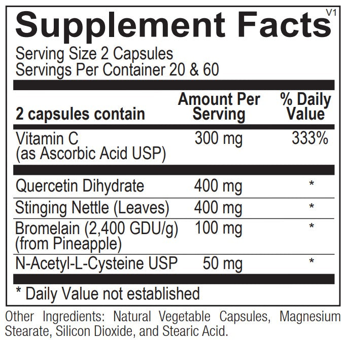 Quercetin has strong antioxidant activity and has been shown to support immune health by mediating the release of inflammatory compounds including leukotrienes and prostaglandins. Quercetin is known for its ability to stabilize mast cells, diminishing the release of histamine, the compound known to cause hypersensitivity reactions during seasonal changes.